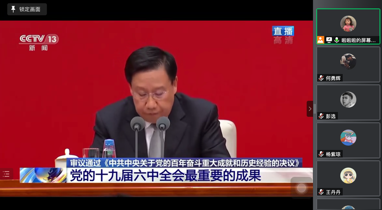 曲哲同学带领大家从“中共中央全体会议的含义”、“十九届六中全会的两个特点”以及“十九届六中全会的成果”以及“十九届六中全会的意义”等方面深刻学习了十九届六中全会的精神。党的十九届六中全会是在重要历史关头召开的一次具有重大历史意义的会议,全会最重要的成果是审议通过了《中共中央关于党的百年奋斗重大成就和历史经验的决议》。全会通过的《决议》共七个部分,在内容摆布上有两个特点:第一个特点是这次主要总结党的百年奋斗重大成就和历史经验,第二个特点是突出中国特色社会主义新时代这个重点,用较大篇幅总结党的十八大以来的原创性思想、变革性实践、突破性进展和标志性成果。曲哲同学号召大家认真领悟十九届六中全会精神,并将其与研会的日常工作相结合,更好地为同学们服务。