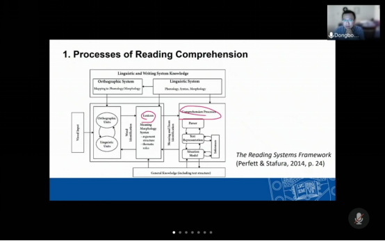 hang Dongbo教授是国际二语阅读和词汇习得领域的专家,他系列讲座题目的是:Lexical Basis of Second Language Reading Comprehension: From Vocabulary Size and Depth to Processing Efficiency”。在讲座中,首先概括性地介绍了二语阅读的认知过程,进而阐明无论是对于书写加工、词汇提取、还是意义激活,词汇识别都是二语者进行阅读活动的前提。词汇识别不仅要求阅读者把词汇融入在线的语境,还要求阅读者选择与特定语境相匹配的词汇语义。欲使阅读流畅高效,词汇识别就要实现自动化。接下来,他阐述了二语词汇知识的多维度性,包括词汇形式、意义、使用的三位一体模式以及词汇知识广度和深度的二分特征。在此基础上,他结合该领域最近几年的研究成果,指出尽管词汇量(即词汇知识广度)与阅读能力直接相关,但是仅有词汇量是不够的,词汇深度知识(包括词汇的多义性、词块、形态变化、词义联系的网络化程度等因素)对于阅读更加重要。最后他还指出,二语阅读者的个体差异、阅读文本的差异以及阅读目的的差异也会影响二语者对于词汇的识别和加工。因此,鉴于词汇知识的多维度性,二语者在阅读过程中要逐渐学会根据不同的文本类型、阅读任务等语境因素灵活地调取词汇资源。
