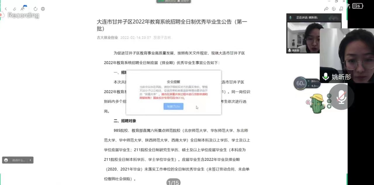 为更好帮助2023届毕业生明确求职规划、提升就业竞争力、实现高质量就业,2022年11月11日晚7点,公共外语教育学院线上举办“公外就业领航计划”系列活动——师姐有话说、教师编专场分享会。此次分享会由学院研究生辅导员曾媛主持,特邀师姐:深圳市教师冯可欣、大连市教师姚欣彤和长春市教师高旭,学院各年级百余名同学线上参会。