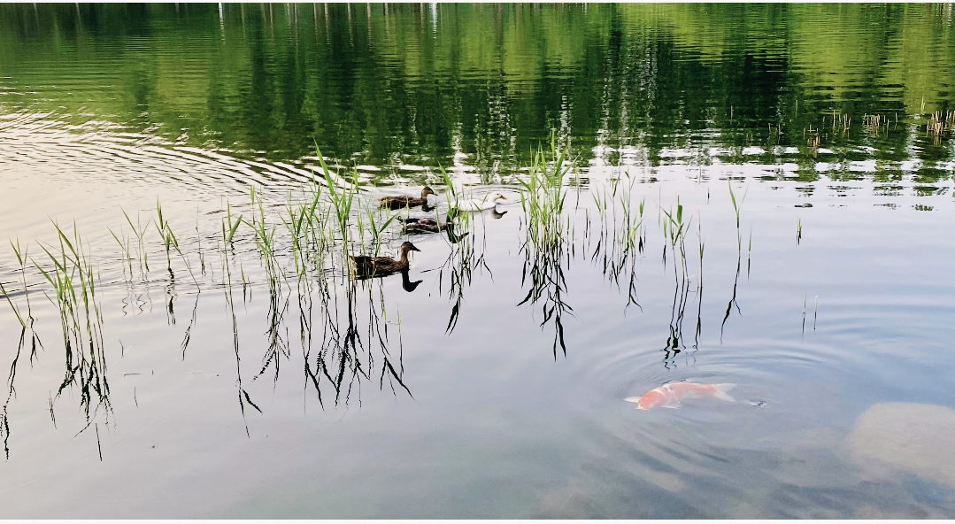 初夏傍晚的清湖,湖水清翠碧绿,湖面波光粼粼,映射出斑驳树影。鱼儿在水下自由徜徉,鸭鸭们在水上惬意畅游,一切静谧而美好。