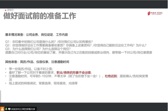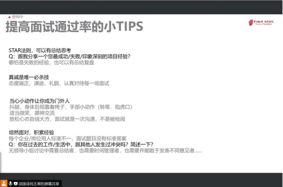 王翠老师结合自身作为面试官的经验,列举了获取心仪公司offer最关键的几个因素,包括学历背景、商务形象、工作经验、简历呈现、面试发挥等等。王翠老师从简历制作、简历投递、面试技巧等方面,全面细致地向大家讲解了在求职面试时的准备工作以及注意事项。