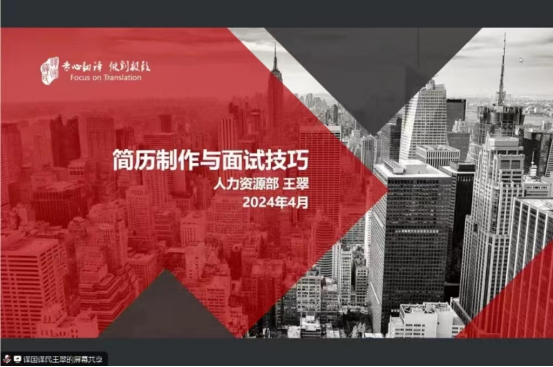 为提高人才培养质量,帮助硕士研究生丰富面试技巧,掌握面试要点,为未来面试就业打下良好基础,202449日晚6点,公共外语教育学院特邀译国译民集团开展了简历制作与面试技巧讲座次讲座由译国译民王翠老师主讲,辅导员林明帅和各年级研究生同学积极参与。